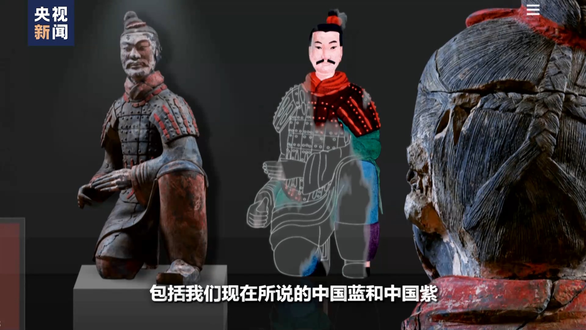 秦始皇帝陵博物院文物保護修復專家 蘭德?。?/strong>那么這在秦俑實際上,目前有八種顏色。紅、黃、綠、藍、紫、白、黑、粉等等,這就是已經(jīng)定型的八種。但是我們最近也要分析比這個還要多,包括有一些它是白里透紅的粉色,還有的它就是幾種合成色,包括我們現(xiàn)在所說的中國藍和中國紫。