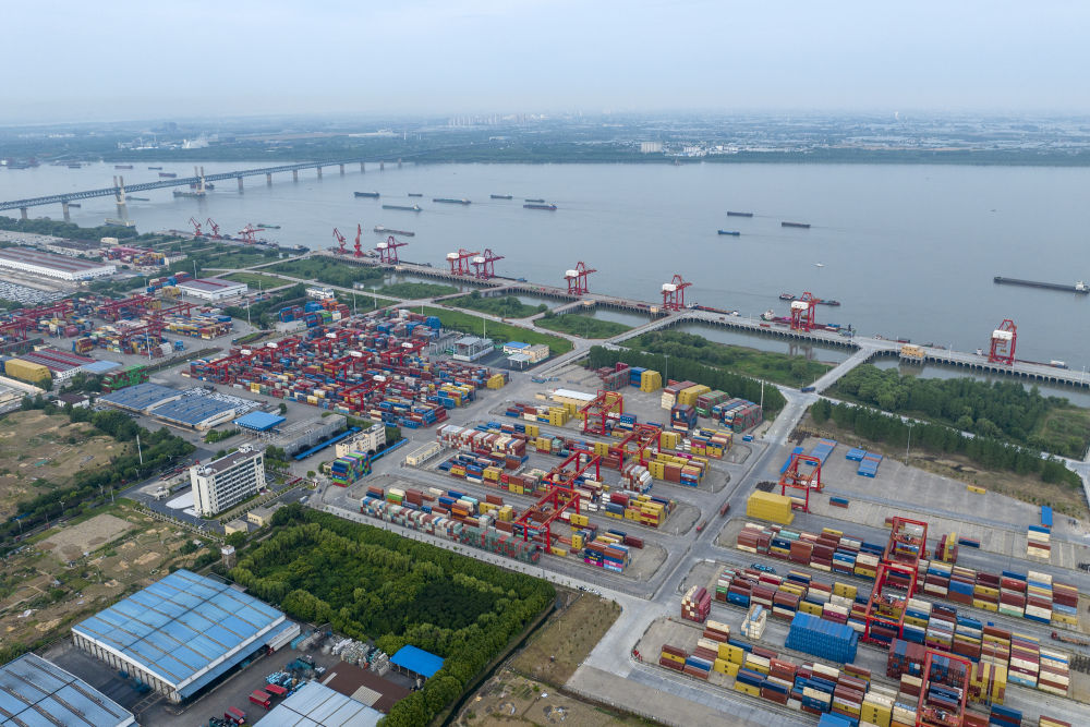 5月26日拍攝的安徽蕪湖港朱家橋港區(qū)國際集裝箱碼頭(無人機照片)。 新華社發(fā)(肖本祥 攝)