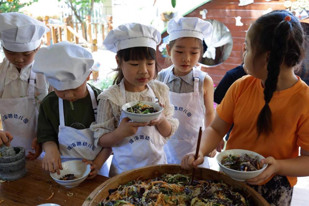 洗菜、烙餅、烤麥子、包餃子、磨豆?jié){……初夏時節(jié),江蘇省徐州市徐海路幼兒園煙火氣升騰,教室外的小院好不熱鬧。