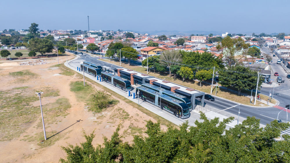 這是2023年7月12日在巴西圣保羅州圣若澤杜斯坎普斯快速公交系統(tǒng)“綠線”始發(fā)站拍攝的比亞迪純電動大巴(無人機照片)。新華社記者王天聰攝