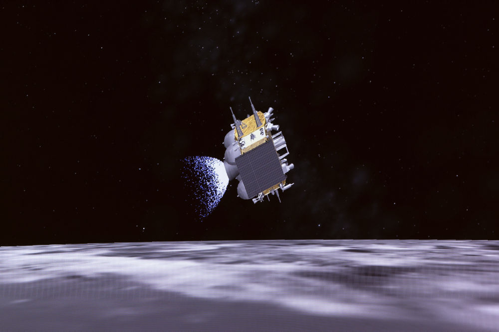 6月4日在北京航天飛行控制中心屏幕上拍攝的嫦娥六號(hào)上升器攜帶月球樣品自月球背面起飛的動(dòng)畫模擬畫面。