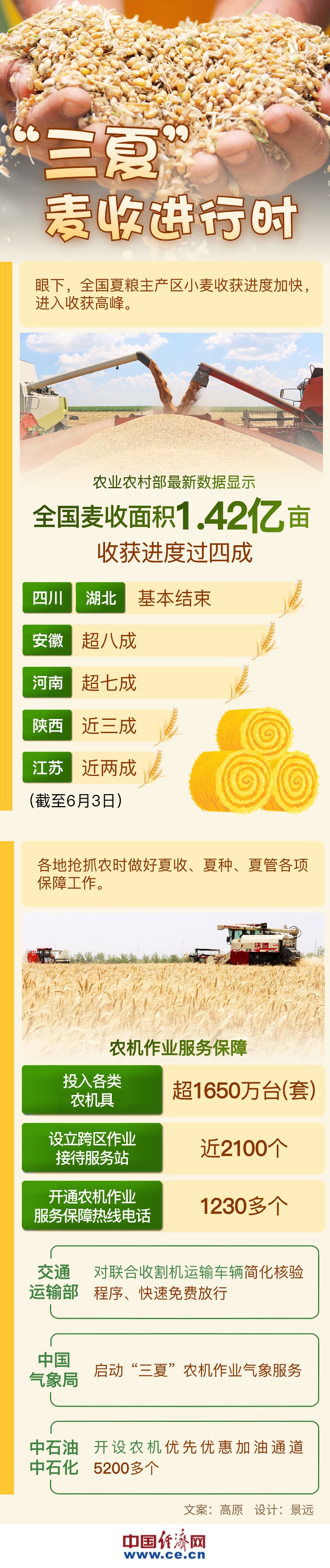 進(jìn)入六月,全國“三夏”大規(guī)模小麥機(jī)收工作全面展開,收獲進(jìn)度加快。據(jù)農(nóng)業(yè)農(nóng)村部最新數(shù)據(jù)顯示,截至6月3日,全國麥?zhǔn)彰娣e1.42億畝,收獲進(jìn)度過四成。