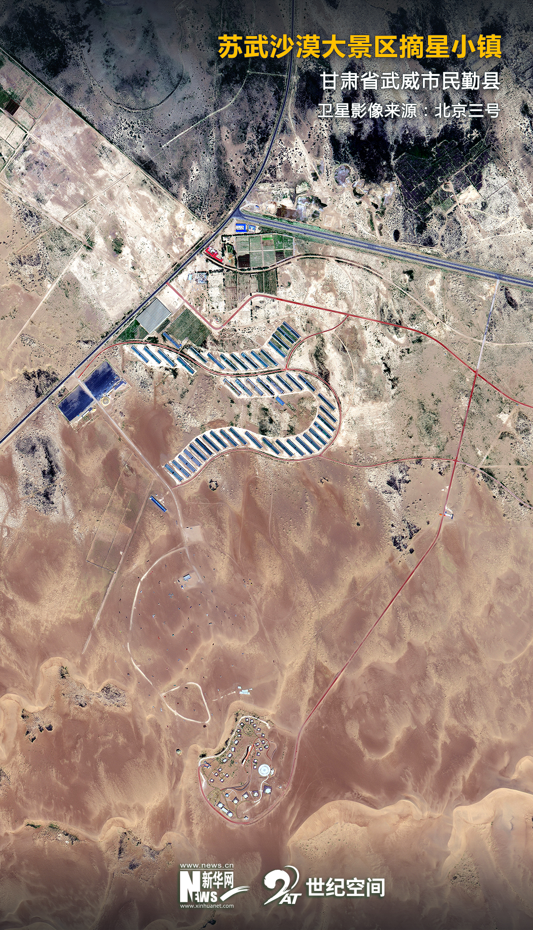 這是甘肅省民勤縣沙漠腹地的“摘星小鎮(zhèn)”(2021年3月4日攝,無人機照片)。新華社記者 郎兵兵 攝