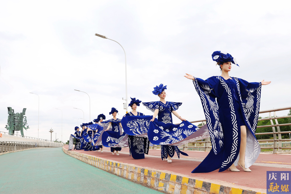 主播們身著刻鏤龍紋、鳳紋、抓髻娃娃、生命樹、魚鉆蓮、牡丹等剪紙紋樣,大V領(lǐng)、魚尾裙、聳肩收腰的“剪云裳”剪紙服裝,行走在傳媒大廈、西峰區(qū)彩虹橋、慶陽市城市海綿運(yùn)動(dòng)綠地等處,全方位、多角度地展示了剪紙服裝的特色與魅力。
