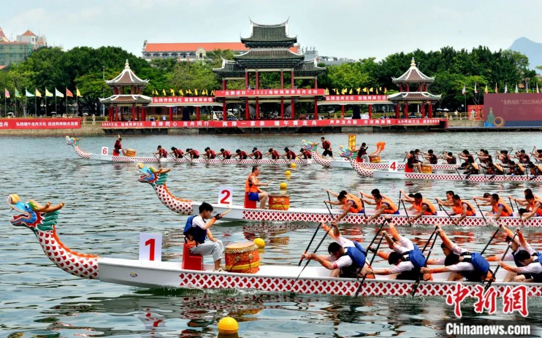 海峽兩岸龍舟賽上,選手們乘風(fēng)逐浪、奮勇爭先。中新社記者 呂明 攝