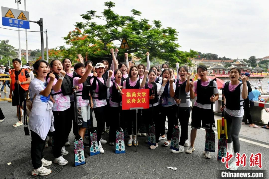 海峽兩岸龍舟賽在廈門集美上演。圖為集美大學(xué)龍舟女隊參加比賽。中新社記者 呂明 攝