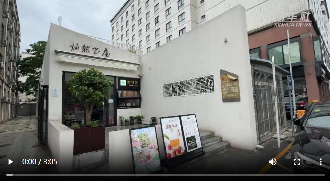 雅致的白色二層小樓,一層是書屋,二層是露臺。一面鏤空幕墻半圍起一個小巧庭院,“春茶到了”的招牌與蔥蘢繁花相映成趣。
