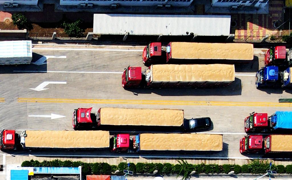 6月15日,在山東省臨沂市平邑縣一處糧食儲備庫夏糧收購現(xiàn)場,運輸車輛排隊售糧(無人機照片)。新華社發(fā)(武紀(jì)全 攝)