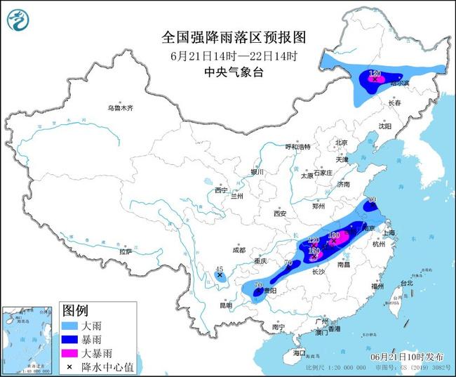 預(yù)計(jì),6月21日14時(shí)至22日14時(shí),貴州中南部、湖南北部、湖北東部和南部、河南東南部、江西西北部、安徽、江蘇以及內(nèi)蒙古東部、黑龍江南部、吉林西北部等地部分地區(qū)有大到暴雨,其中,安徽中部、湖北東部和南部、湖南東北部、內(nèi)蒙古東部、黑龍江西南部、吉林西北部等地局地有大暴雨(100~180毫米)。上述部分地區(qū)伴有短時(shí)強(qiáng)降水(最大小時(shí)降雨量30~50毫米,局地可超過80毫米),局地有雷暴大風(fēng)等強(qiáng)對流天氣。