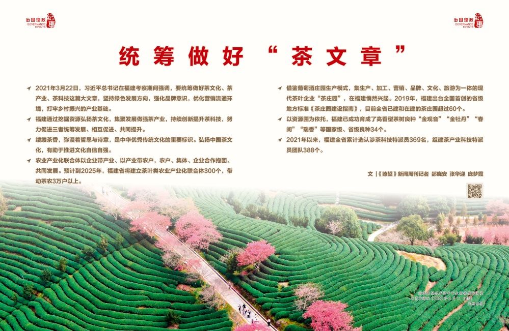 2021年8月,福建省農(nóng)業(yè)農(nóng)村廳出臺《關于統(tǒng)籌做好“茶文化、茶產(chǎn)業(yè)、茶科技”這篇大文章推動茶產(chǎn)業(yè)高質(zhì)量發(fā)展的若干意見》,制定專項政策措施,各茶葉重點市縣相繼成立工作小組、工作專班,通過挖掘資源弘揚茶文化,集聚發(fā)展做強茶產(chǎn)業(yè),持續(xù)創(chuàng)新提升茶科技,努力促進三者統(tǒng)籌發(fā)展、相互促進、共同提升。