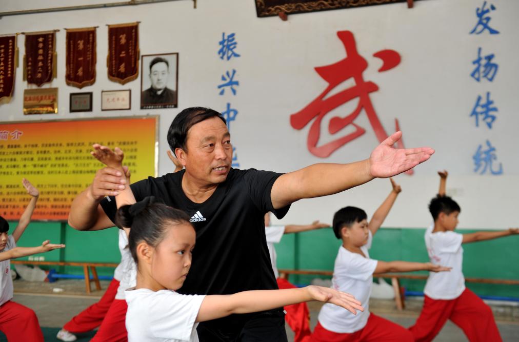 2017年6月17日,石同鼎(中)在泊頭六合武館內(nèi)教授小學(xué)生六合拳法。