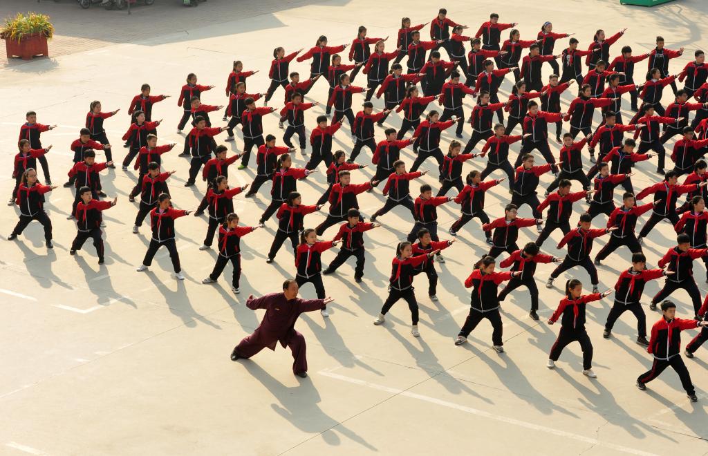 2020年11月19日,六合拳傳承人石同鼎(下)在河北滄州泊頭西關(guān)回民小學(xué)帶領(lǐng)學(xué)生們練習(xí)六合拳。