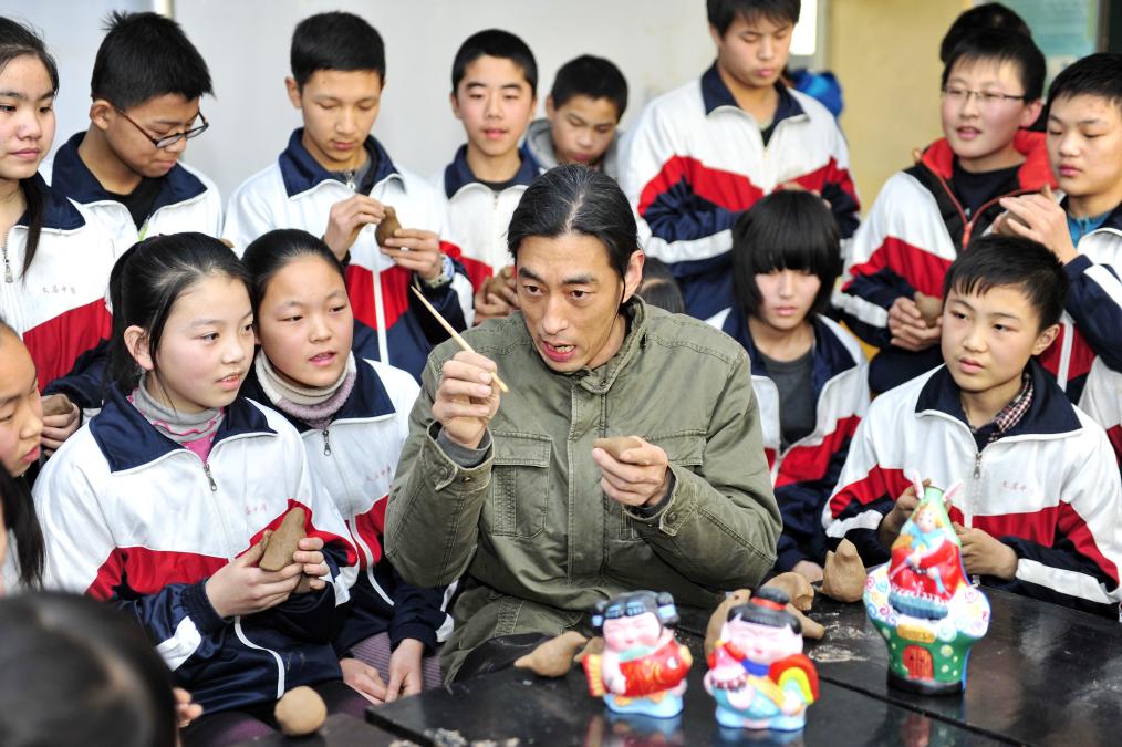 2015年1月9日,在河北省泊頭市文廟中學(xué),“三癡齋”泥塑傳承人宋長(zhǎng)峰(前中)在教學(xué)生們制作鳥哨。