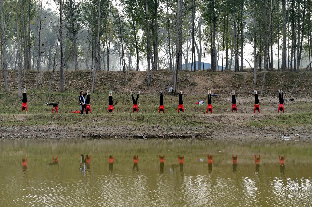 2014年10月24日,吳橋國(guó)際雜技藝術(shù)學(xué)校的學(xué)生們?cè)诖筮\(yùn)河邊練功。