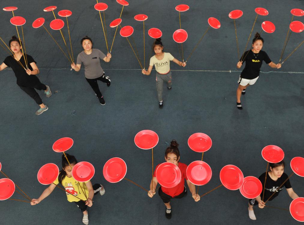 2021年9月28日,演員在第十八屆中國(guó)吳橋國(guó)際雜技藝術(shù)節(jié)開幕式上表演《俏花旦——集體空竹》。