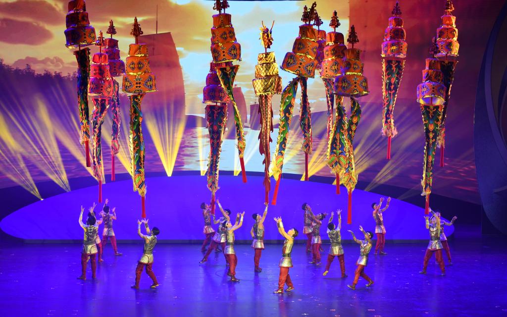 2023年10月25日,在第十九屆中國(guó)吳橋國(guó)際雜技藝術(shù)節(jié)上,中國(guó)雜技演員在表演《龍躍神州——中幡》。