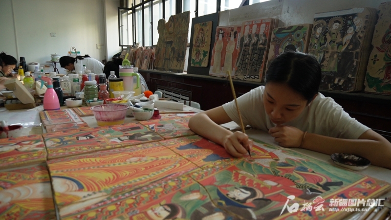 烏魯木齊職業(yè)大學(xué)學(xué)生在制作龜茲壁畫復(fù)原作品。石榴云/新疆日報(bào) 記者宋海波攝