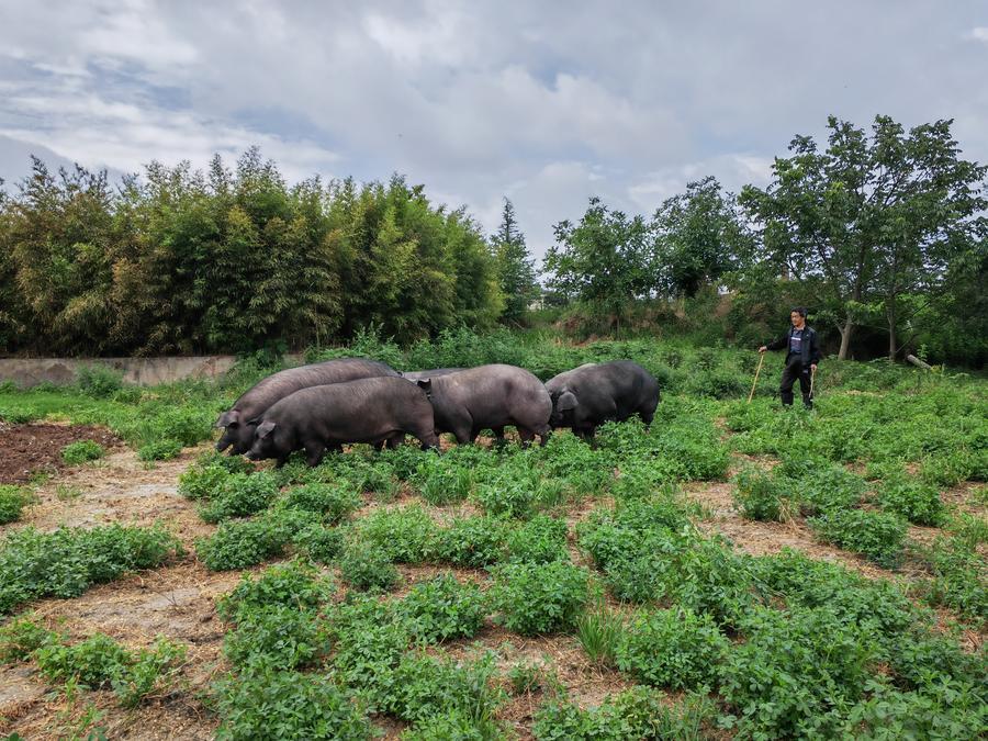 6月2日,云南老浦家火腿實(shí)業(yè)發(fā)展有限公司養(yǎng)殖的烏金豬在覓食。新華社記者 林碧鋒 攝