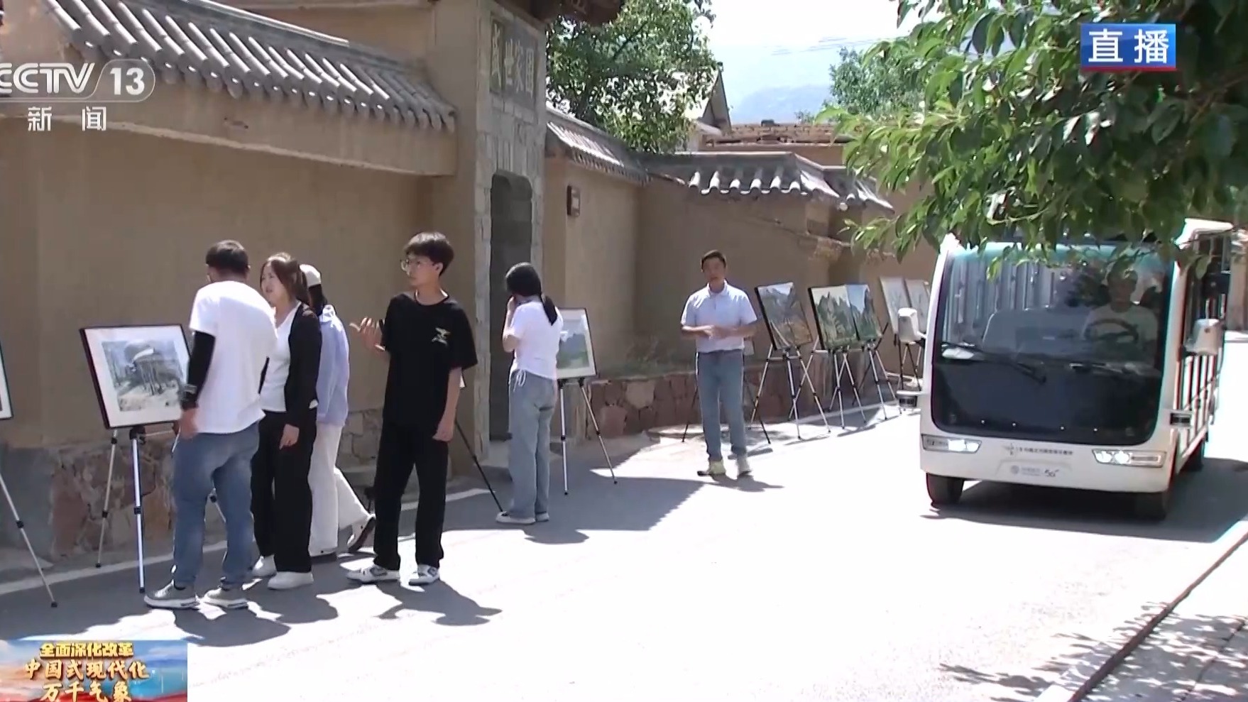 總臺記者 胡曉冬:走在村里,第一感受就是這個村子已經(jīng)闖進藝術(shù)圈了。我相信大家已經(jīng)注意到我身后的畫展,這些畫展時不時會出現(xiàn)在小山村的大街小巷中,讓藝術(shù)氣息充滿各個角落。