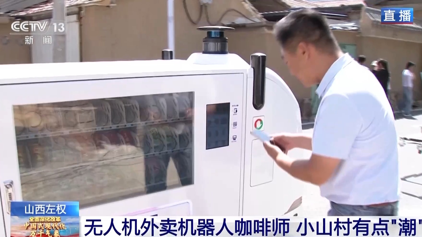 這個小山村里的科技范不止于此,大家通過鏡頭可以看到,在我身旁往來不少車輛,它們好像有一些不同,你看這個在街上到處行進的無人售貨車,我們走到它旁邊就會停止,然后手機掃描二維碼可以購買到飲料、零食等商品了。