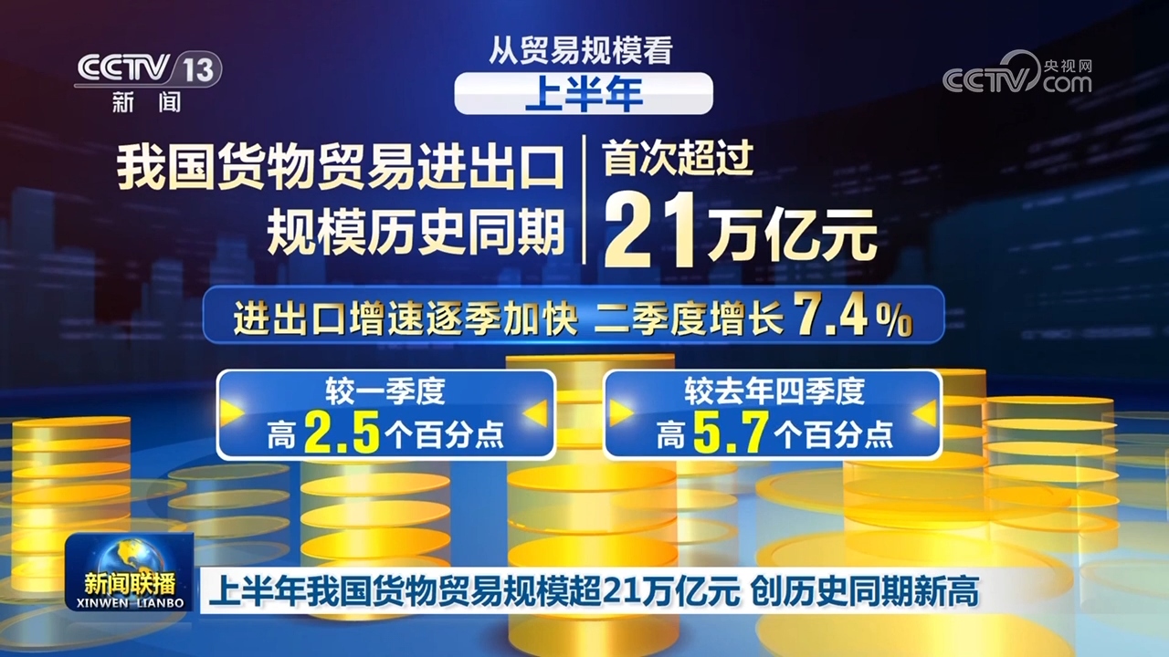 從貿(mào)易規(guī)???,上半年,我國(guó)貨物貿(mào)易進(jìn)出口規(guī)模歷史同期首次超過(guò)21萬(wàn)億元。進(jìn)出口增速逐季加快,二季度增長(zhǎng)7.4%,較一季度和去年四季度分別高2.5個(gè)、5.7個(gè)百分點(diǎn),貨物貿(mào)易進(jìn)出口質(zhì)量持續(xù)提升、規(guī)模較快增長(zhǎng)。
