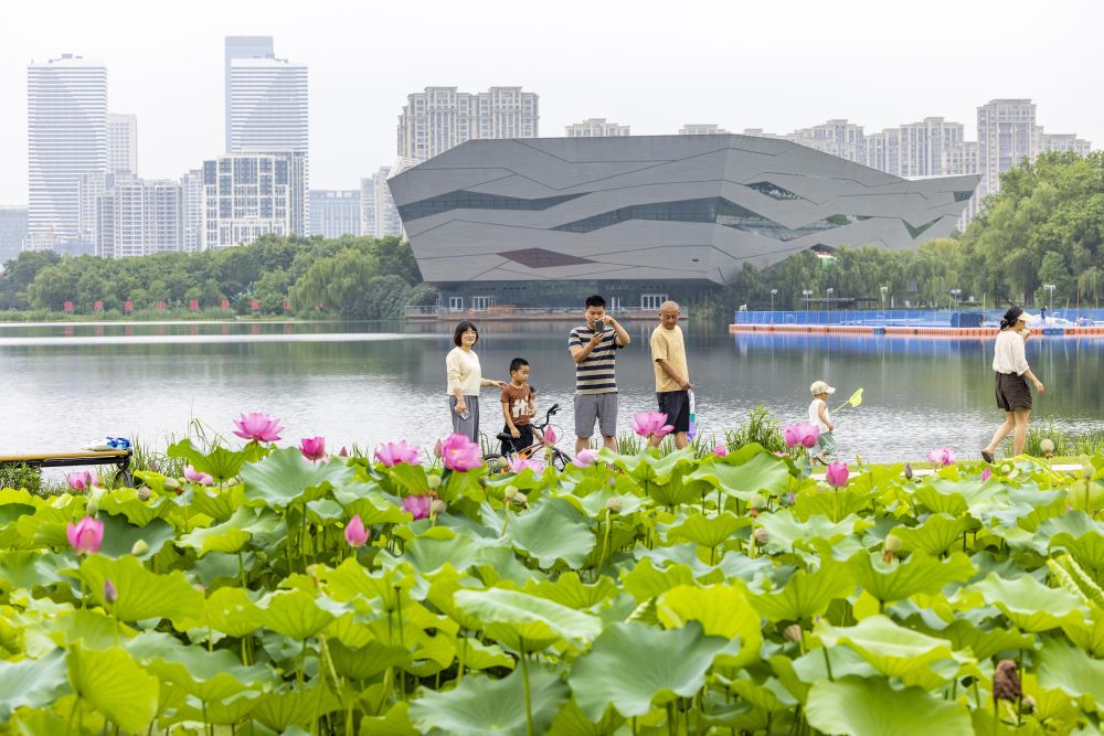 7月14日,人們?cè)诮K省泰州市天德湖公園荷花池賞荷游玩。新華社發(fā)(湯德宏攝)