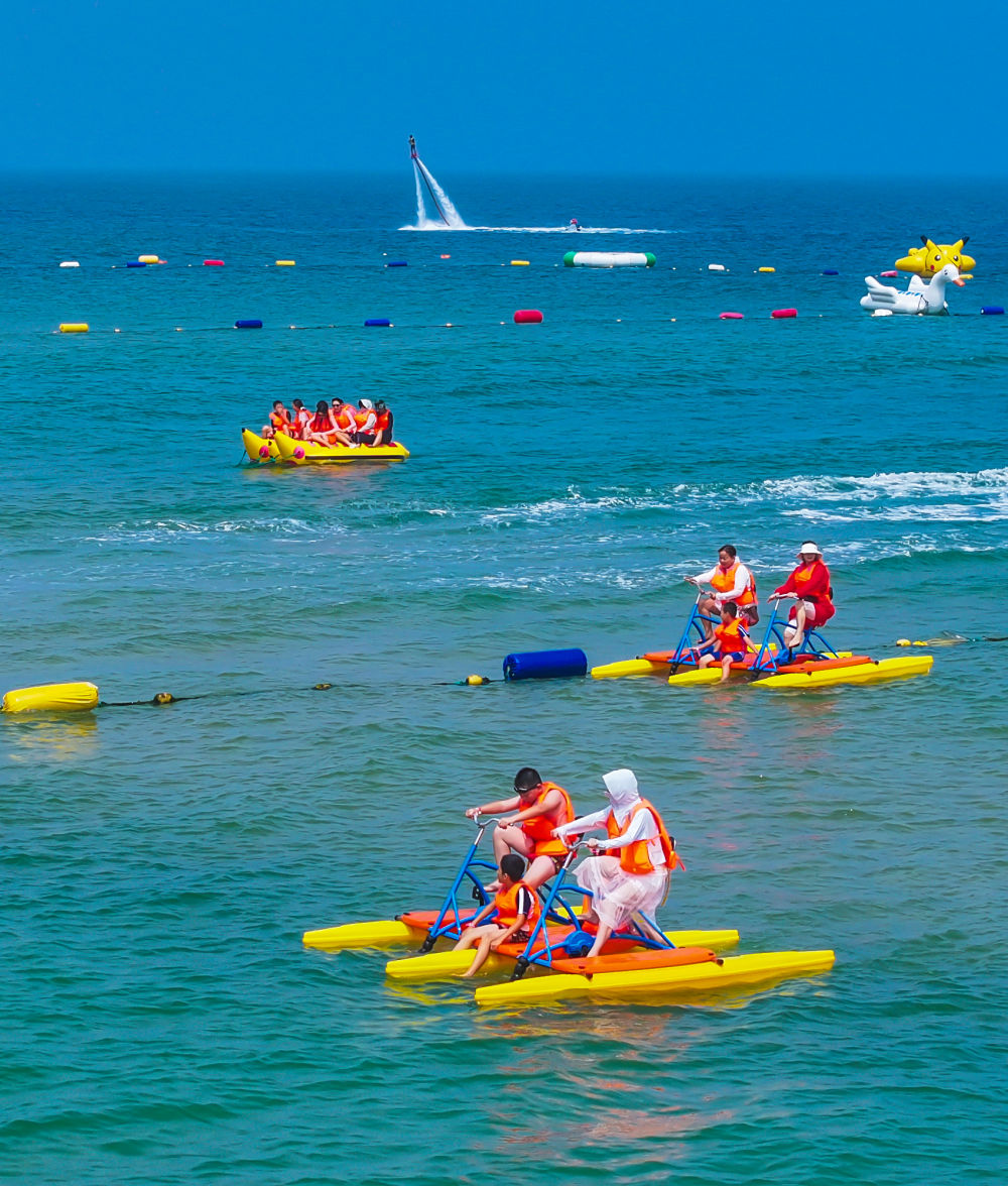 7月13日,游客在山東省榮成市那香海海水浴場(chǎng)體驗(yàn)水上娛樂(lè)項(xiàng)目(無(wú)人機(jī)照片)。新華社發(fā)(李信君攝)