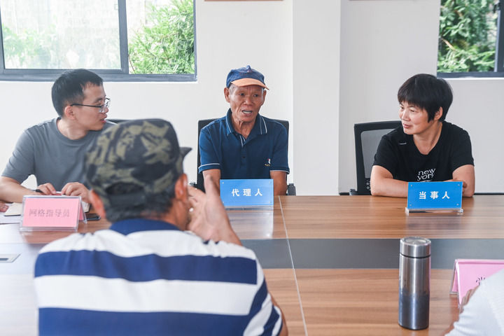 2023年7月26日,在浙江省諸暨市東白湖鎮(zhèn)婁東村新時代文明實踐站的文明共富會客廳內,網(wǎng)格長召集村里矛盾雙方當事人以及黨員代表、鄉(xiāng)賢代表、人大代表等成員進行宅基地指標糾紛的現(xiàn)場調解。新華社記者 徐昱 攝