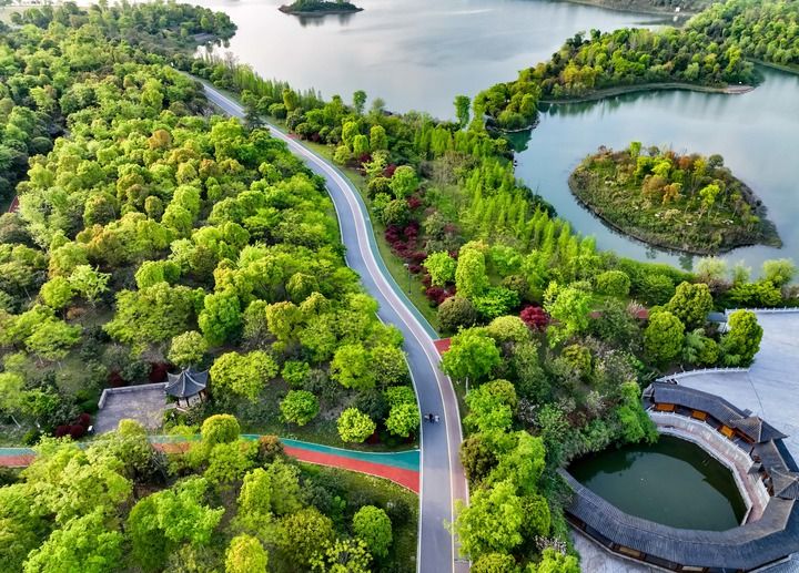 這是2022年4月5日拍攝的江西省萍鄉(xiāng)市萍水湖濕地公園(無人機照片)。萍鄉(xiāng)市將治水與綠化相結合,沿萍水河打造萍水湖濕地公園。新華社發(fā)(李桂東 攝)