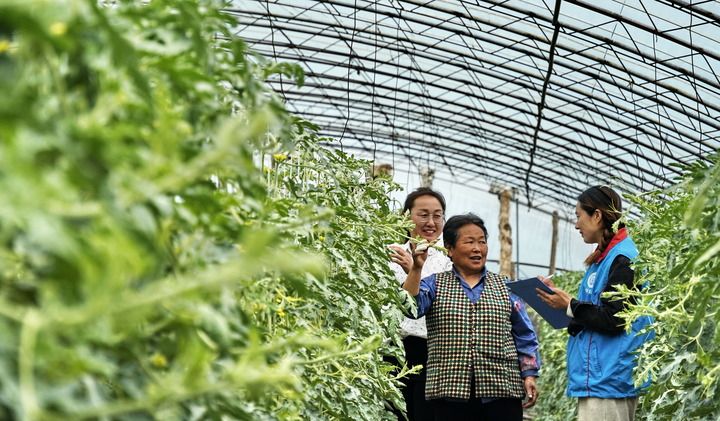 2024年4月9日,北京市大興區(qū)龐各莊鎮(zhèn)李家巷村政務服務站的工作人員來到大棚內為瓜農(nóng)辦理社保業(yè)務。新華社記者 李欣 攝