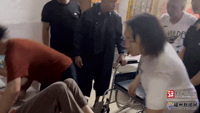 小心翼翼地將行走不便的陳奶奶抱到輪椅上