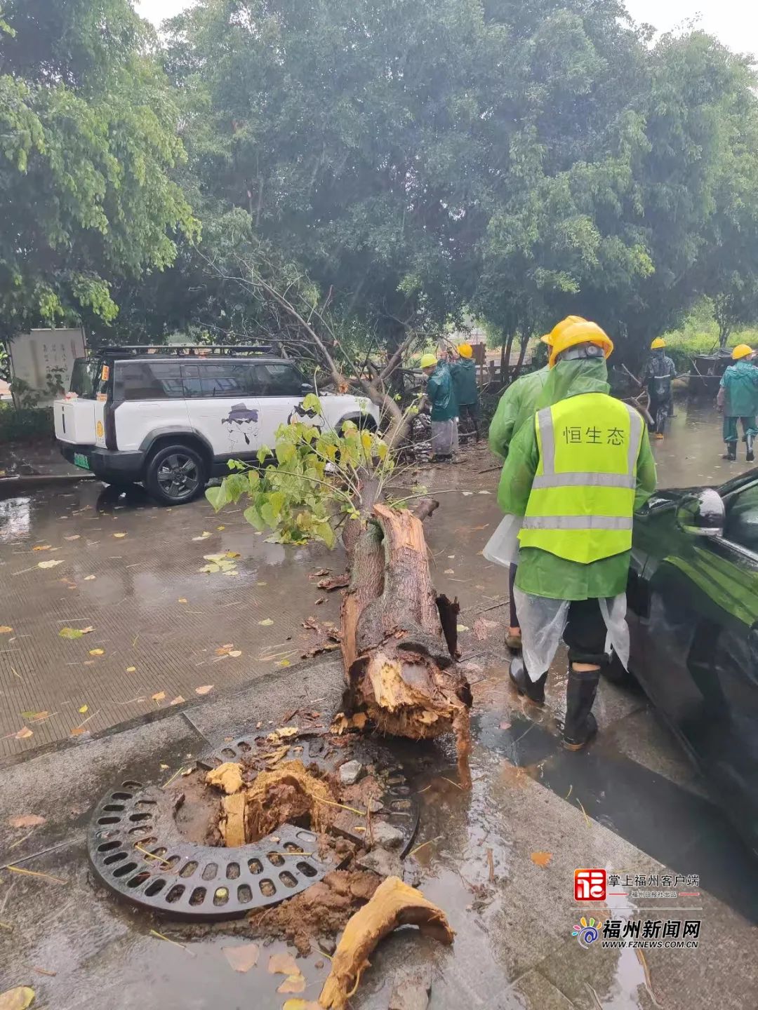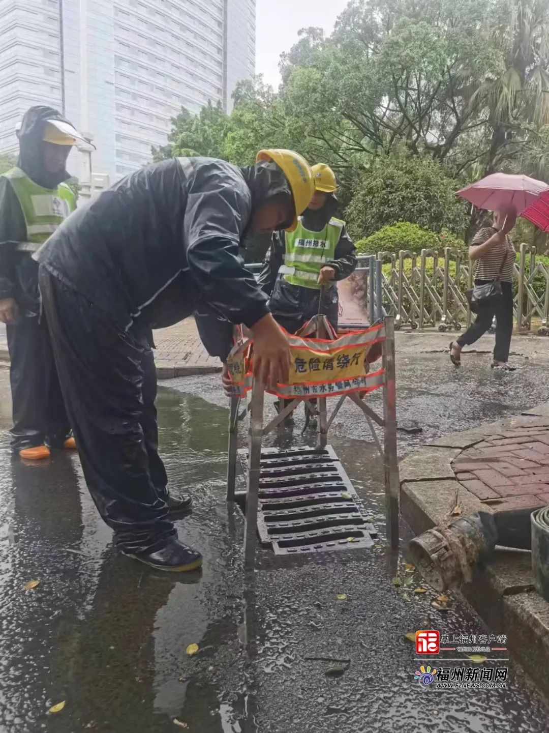 福州市城市排水有限公司工作人員提前打開(kāi)邊井和井蓋并清掏樹(shù)葉垃圾提高過(guò)水率