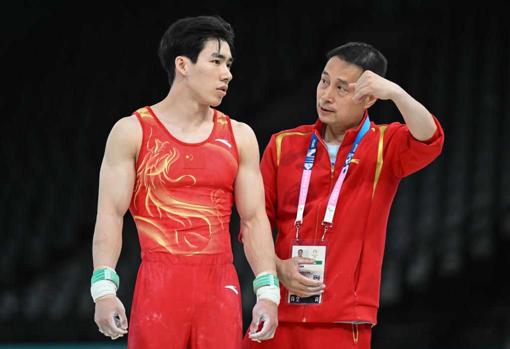7月24日,中國男子體操隊(duì)在巴黎進(jìn)行賽臺(tái)訓(xùn)練,中國隊(duì)選手張博恒(左)在準(zhǔn)備吊環(huán)項(xiàng)目訓(xùn)練。新華社記者 程敏 攝