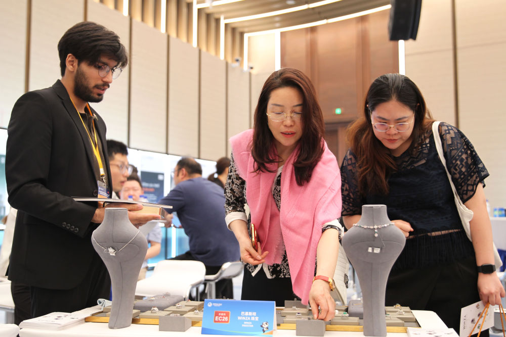 2024年7月9日,一名外國參展企業(yè)工作人員(左)向采購商介紹企業(yè)產(chǎn)品。(陳浩明 攝)