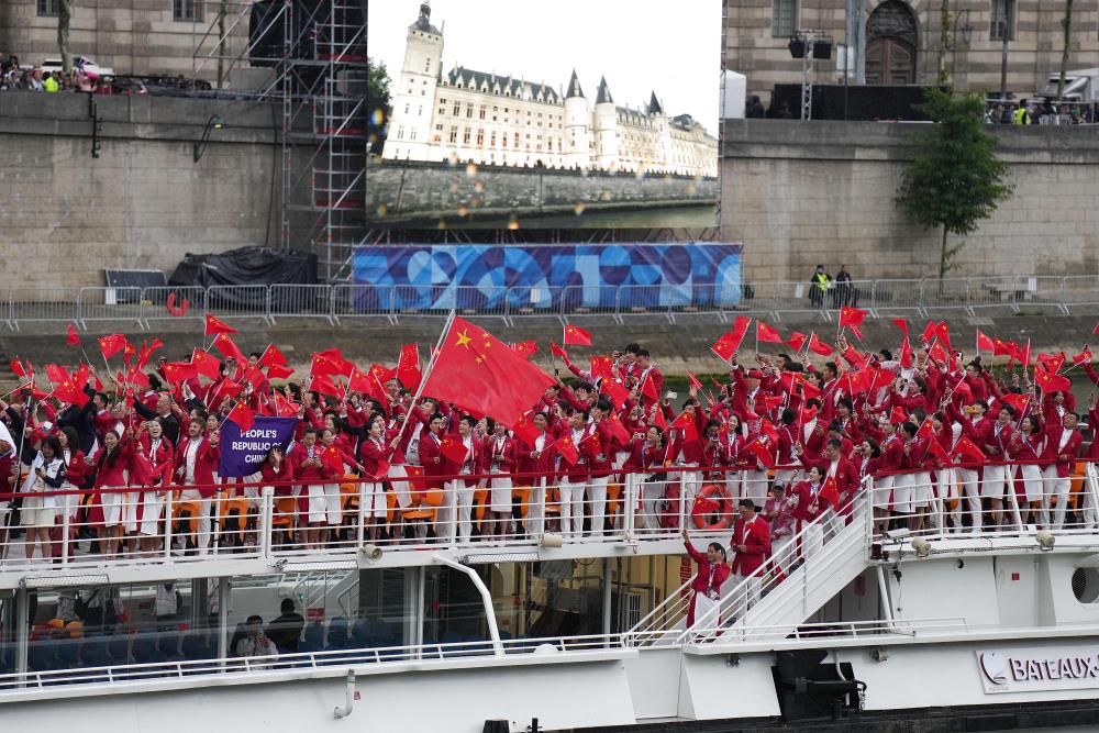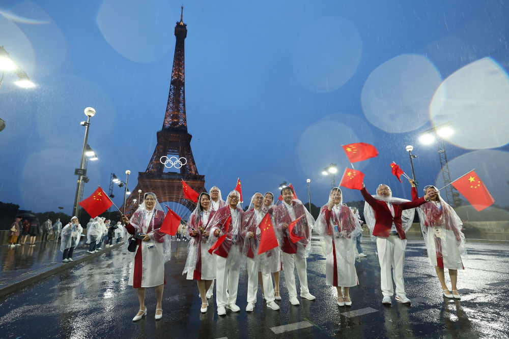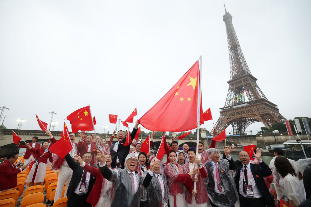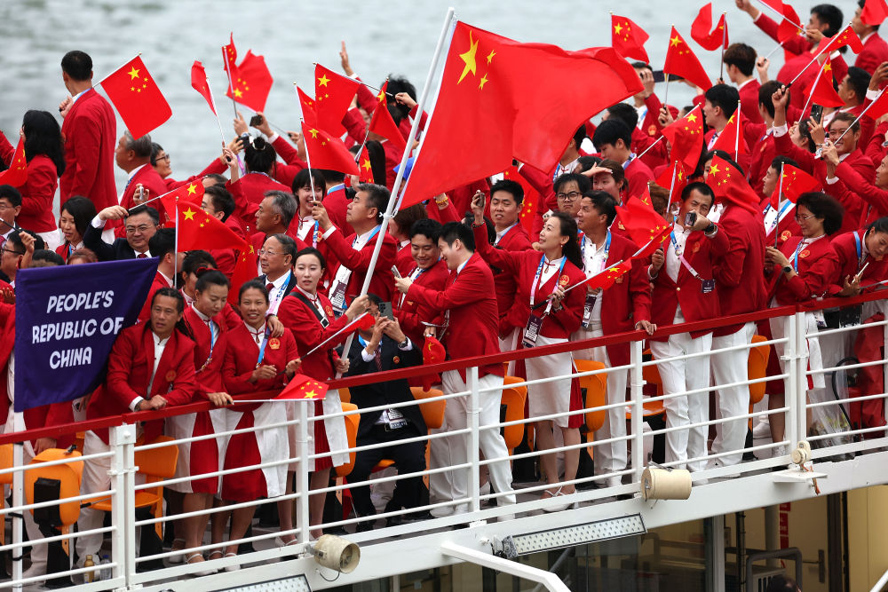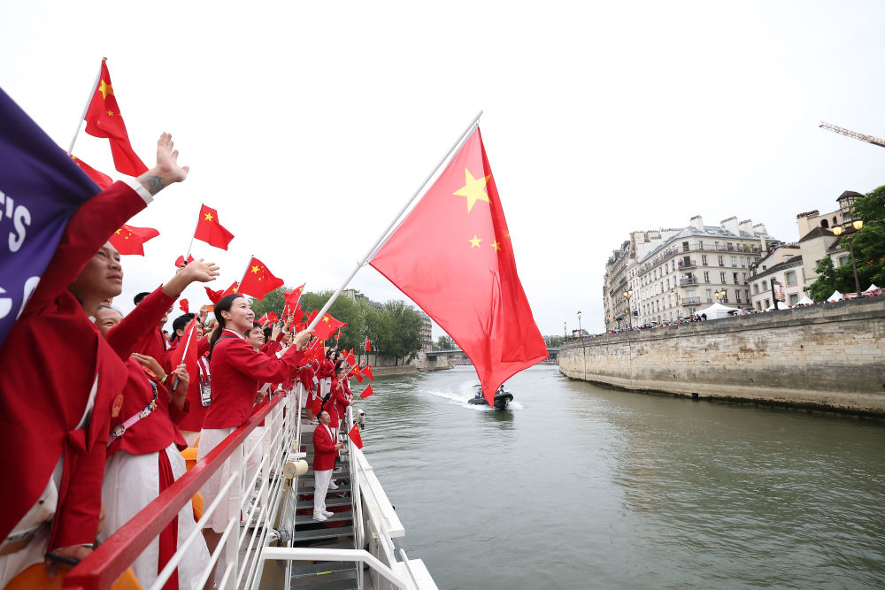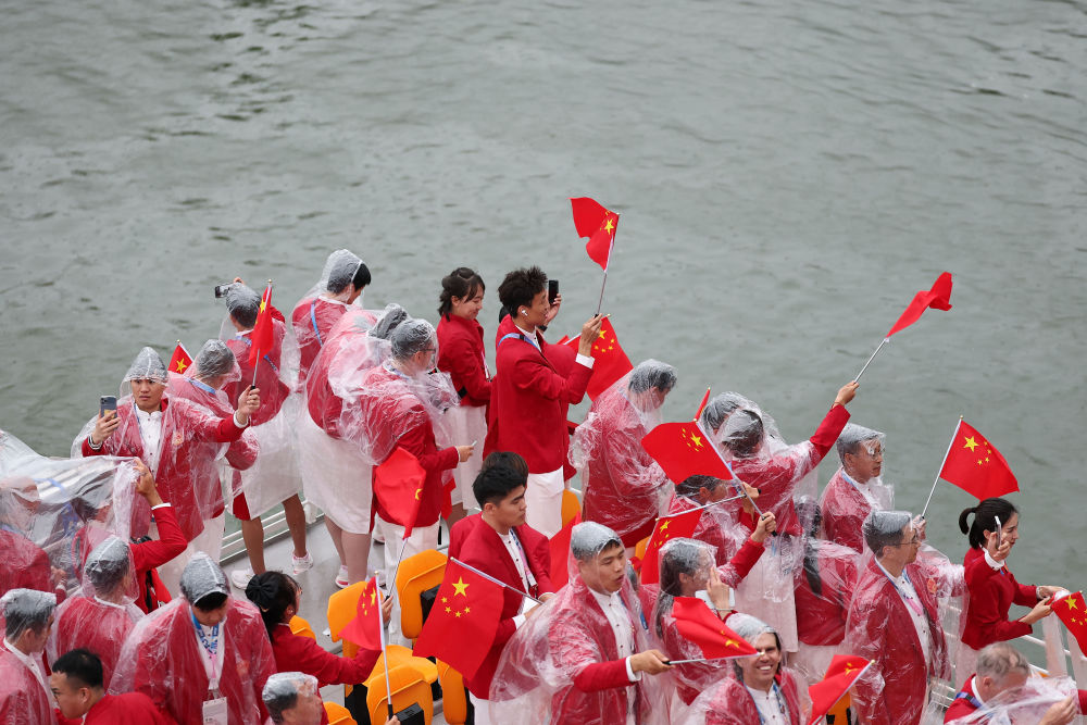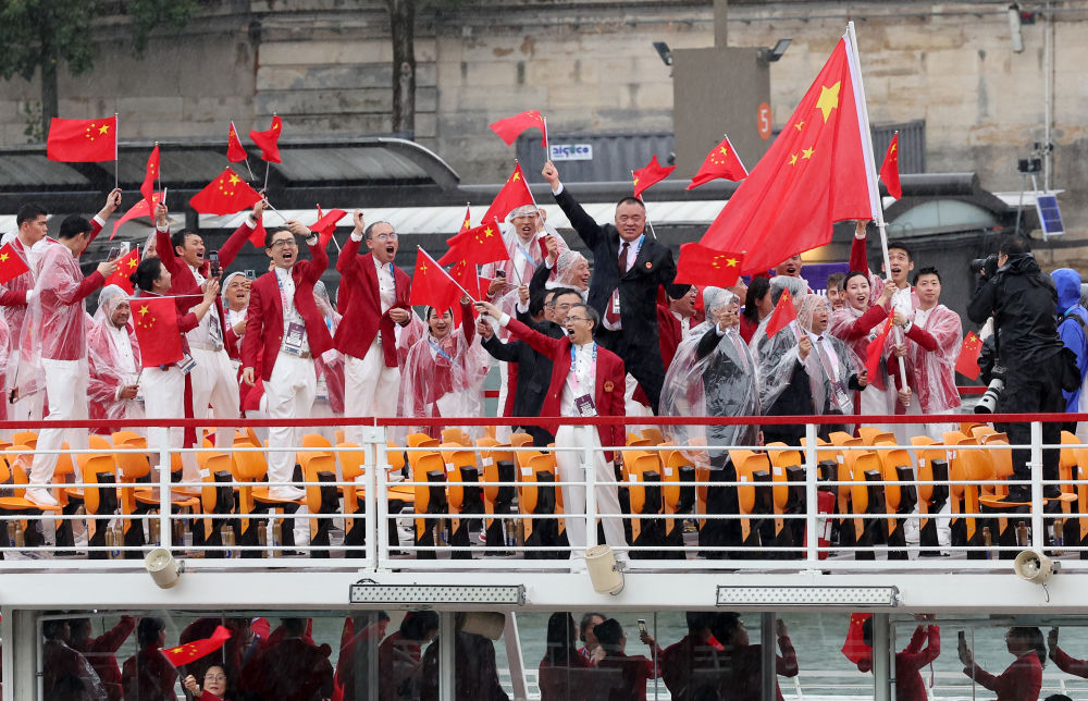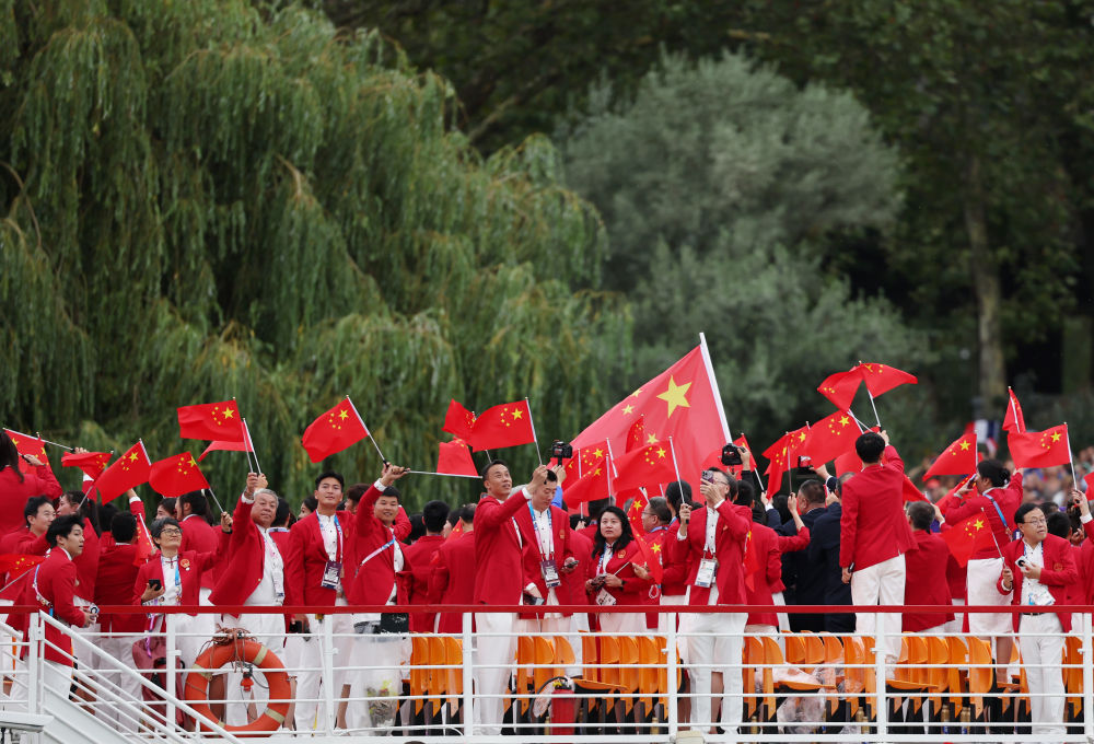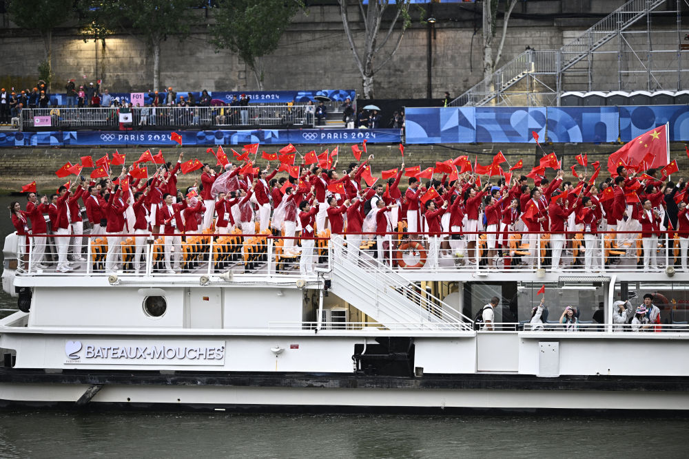 當(dāng)?shù)貢r(shí)間7月26日,第33屆夏季奧林匹克運(yùn)動(dòng)會(huì)開(kāi)幕式在法國(guó)巴黎舉行。乒乓球運(yùn)動(dòng)員馬龍、花樣游泳運(yùn)動(dòng)員馮雨高擎五星紅旗,中國(guó)體育代表團(tuán)運(yùn)動(dòng)員乘船在塞納河巡游。