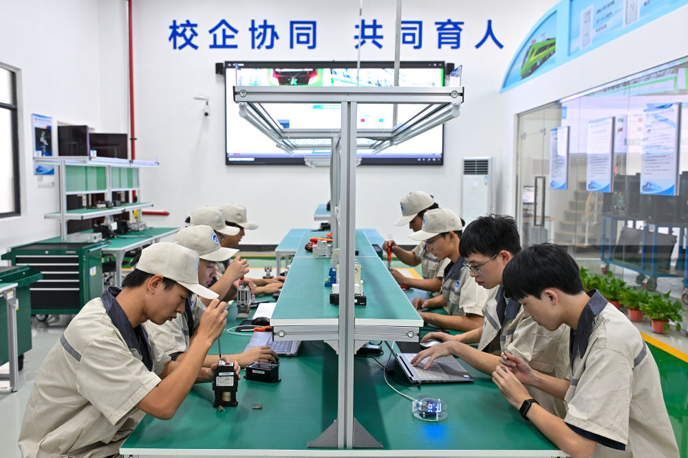 7月26日,湖南鐵道職業(yè)技術(shù)學院的學生在車載電源系統(tǒng)運維實訓室進行核心零部件的拆裝與檢測訓練。該實訓室可開展軌道車輛逆變裝置運行、維護、試驗、檢修等實習實訓,電源變換技術(shù)、電力電子技術(shù)等課程實習實訓。新華社記者 李鑫 攝