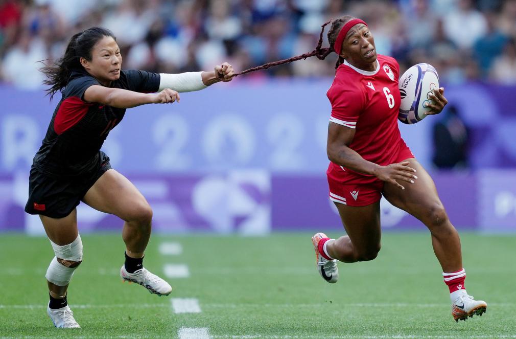 7月29日,中國隊球員劉瀟倩(左)與加拿大隊球員夏麗蒂·威廉姆斯在比賽中。當(dāng)日,在巴黎奧運(yùn)會七人制橄欖球女子分組循環(huán)賽A組比賽中,中國隊17比26不敵加拿大隊。 新華社記者 呂小煒 攝