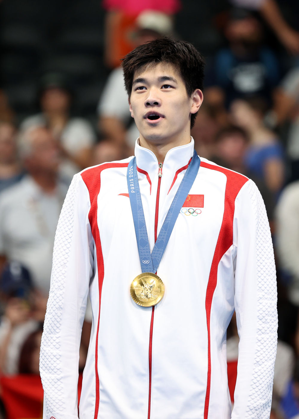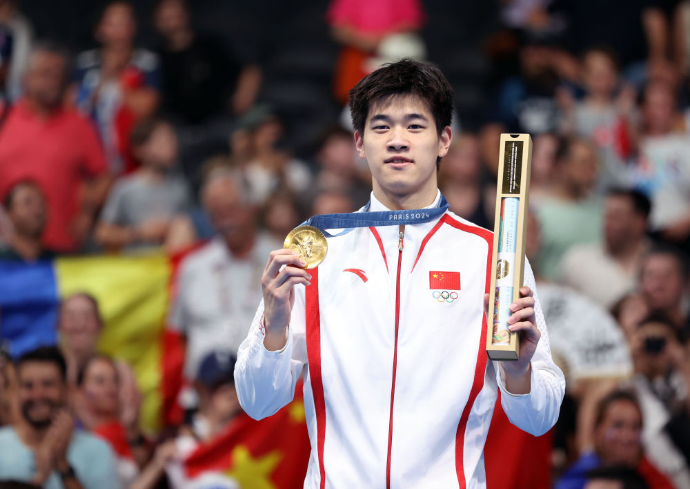 ↑中國選手潘展樂在頒獎儀式上。新華社記者 雒圓 攝