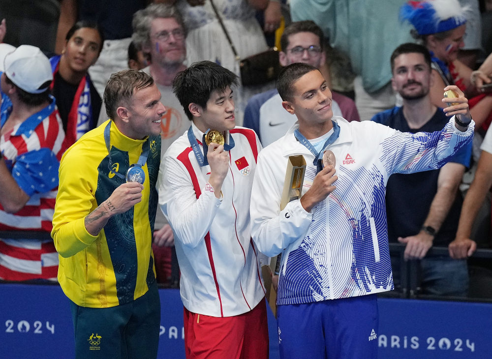 ↑冠軍中國選手潘展樂(中)、亞軍澳大利亞選手查默斯(左)與季軍羅馬尼亞選手波波維奇在頒獎儀式后。新華社記者 雒圓 攝