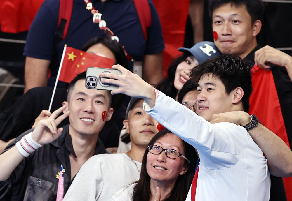 ↑中國選手潘展樂(右一)在頒獎儀式后與觀眾合影。新華社記者 雒圓 攝
