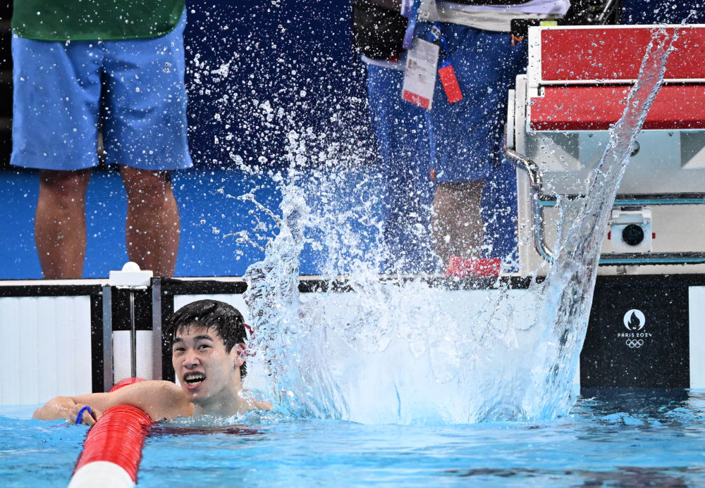 ↑中國選手潘展樂在比賽后慶祝。