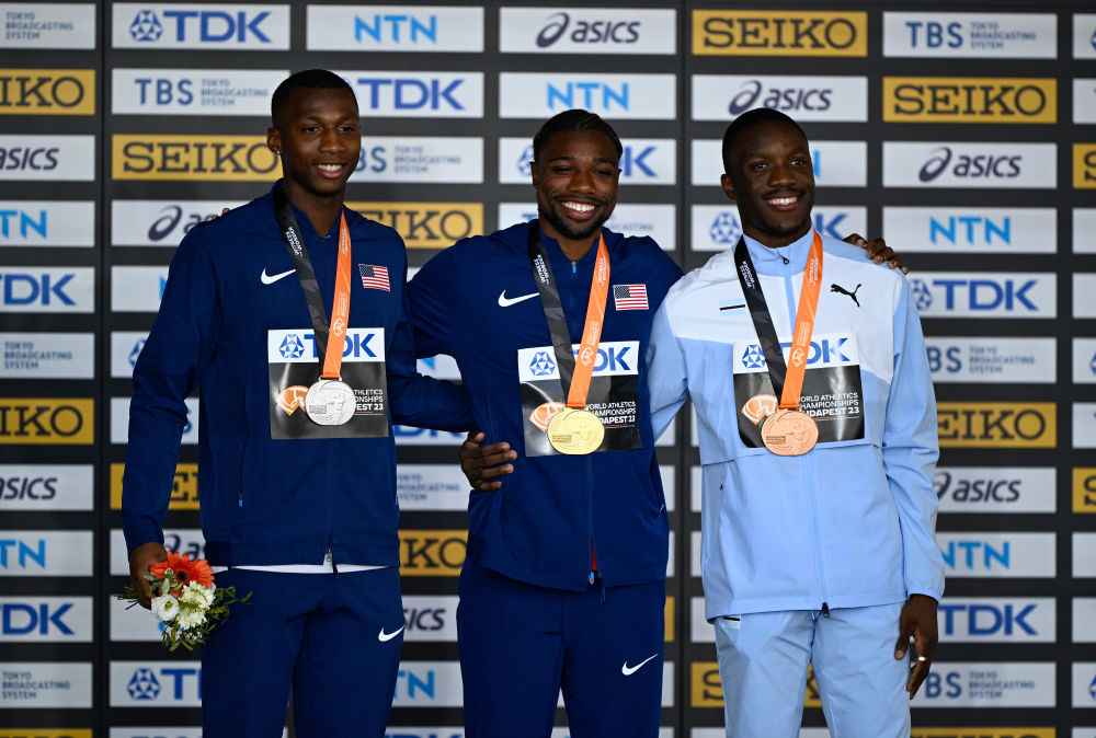 埃里揚·奈頓(左)在2023年田徑世錦賽中獲得男子200米亞軍。新華社記者 宋彥樺 攝