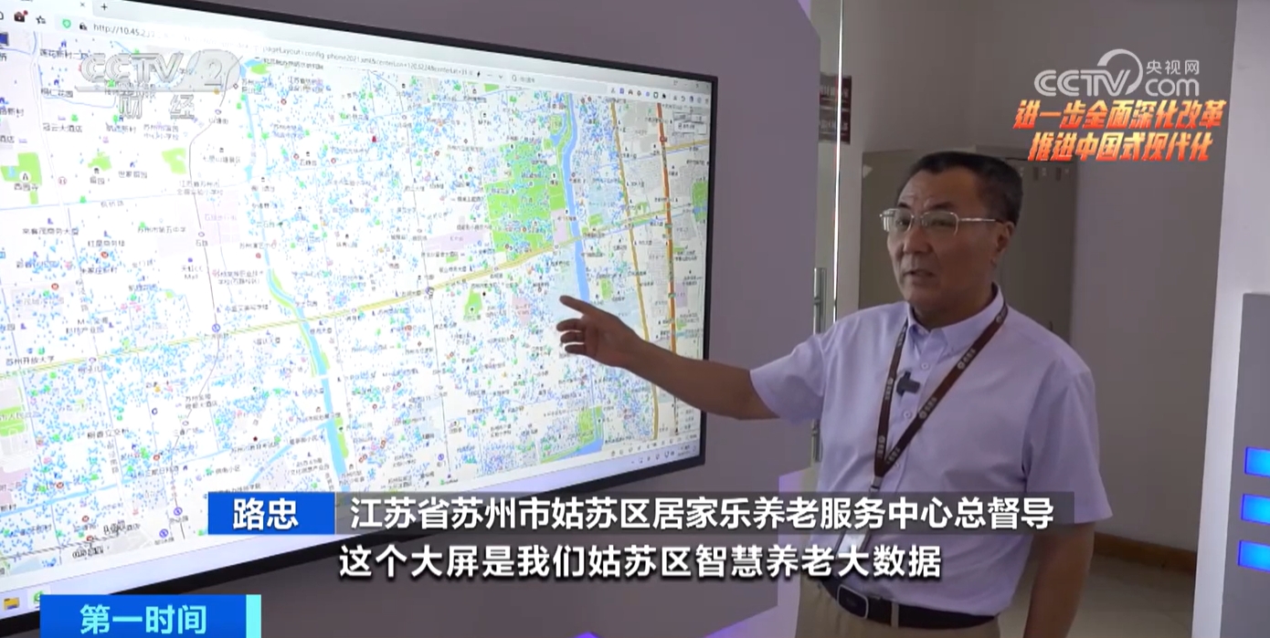 江蘇蘇州姑蘇區(qū)居家樂養(yǎng)老服務(wù)中心總督導(dǎo)路忠介紹,這個大屏是姑蘇區(qū)智慧養(yǎng)老大數(shù)據(jù)在線實時的數(shù)字地圖,粉色的點就是現(xiàn)在正在服務(wù)中的284戶老人,綠色的點位就是現(xiàn)在還有900多個老人在等待著上門服務(wù),大量的藍色的小點是服務(wù)用戶,是整個“虛擬養(yǎng)老院”的老人。