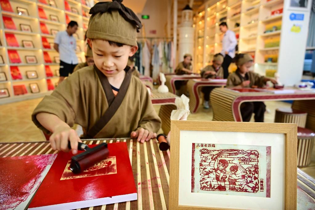 暑假期間,位于青島棧橋書(shū)店的印象國(guó)風(fēng)藝術(shù)館舉行拓印研學(xué)活動(dòng),吸引學(xué)生前來(lái)學(xué)習(xí)、體驗(yàn)。新華社記者 李紫恒 攝