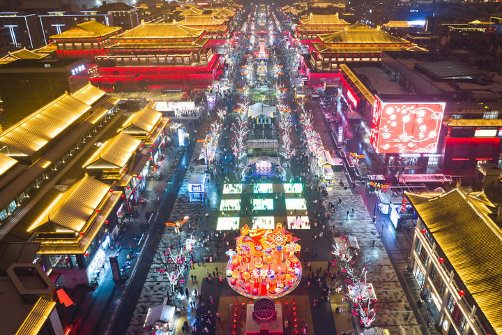 西安大唐不夜城景區(qū)景色(2024年2月2日攝,無(wú)人機(jī)照片)。新華社記者 邵瑞 攝