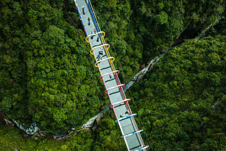 2023年8月20日,游客在湖北省恩施州建始縣地心谷景區(qū)游玩(無(wú)人機(jī)照片)。新華社記者 肖藝九 攝