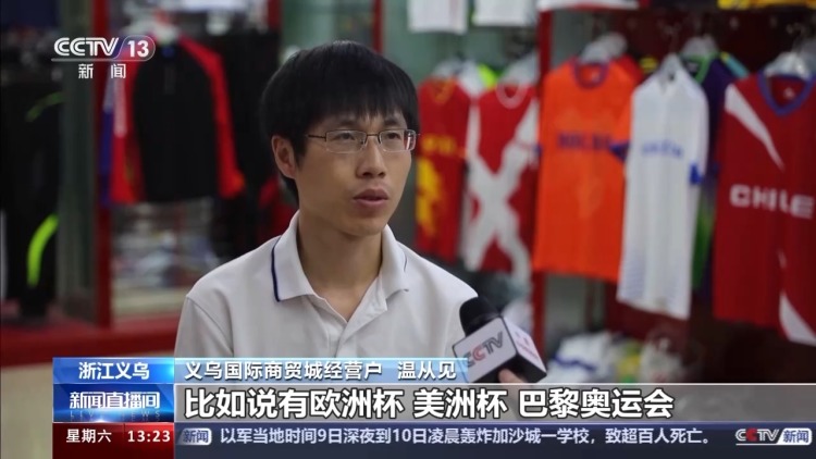 義烏國際商貿(mào)城經(jīng)營戶 溫從見:今年因?yàn)槭鞘澜绱筚惸?,比如說有歐洲杯、美洲杯、巴黎奧運(yùn)會,差不多3月份開始,我們就已經(jīng)著手開始接單、打樣、生產(chǎn)這一系列的運(yùn)動服飾。我們總共3個賽事下來銷了30萬件左右。