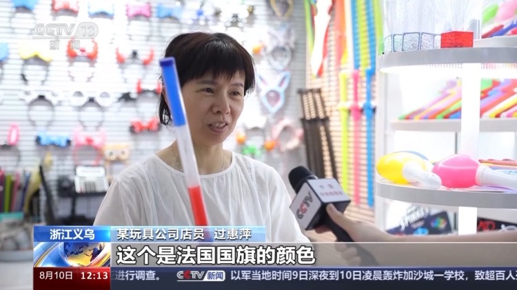 某玩具公司店員 過惠萍:這個是法國國旗的顏色,這款走量還可以,比往年訂單多10%到20%。