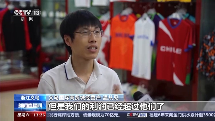 義烏國際商貿(mào)城經(jīng)營戶 溫從見:我們以前做設(shè)計的時候,比如說我們做法國隊的球衣,可能只設(shè)置了一兩個,現(xiàn)在我們做一個款式,我們會設(shè)置4到5個方案,包括我們自己也會先去試賣,讓自己的產(chǎn)品做得更加多元化,更加亮麗一點(diǎn),能夠在這輪流量過來的時候,能夠吸引來我店里他可以駐足的時間長一點(diǎn),我們這個訂單的概率會大一點(diǎn)。
