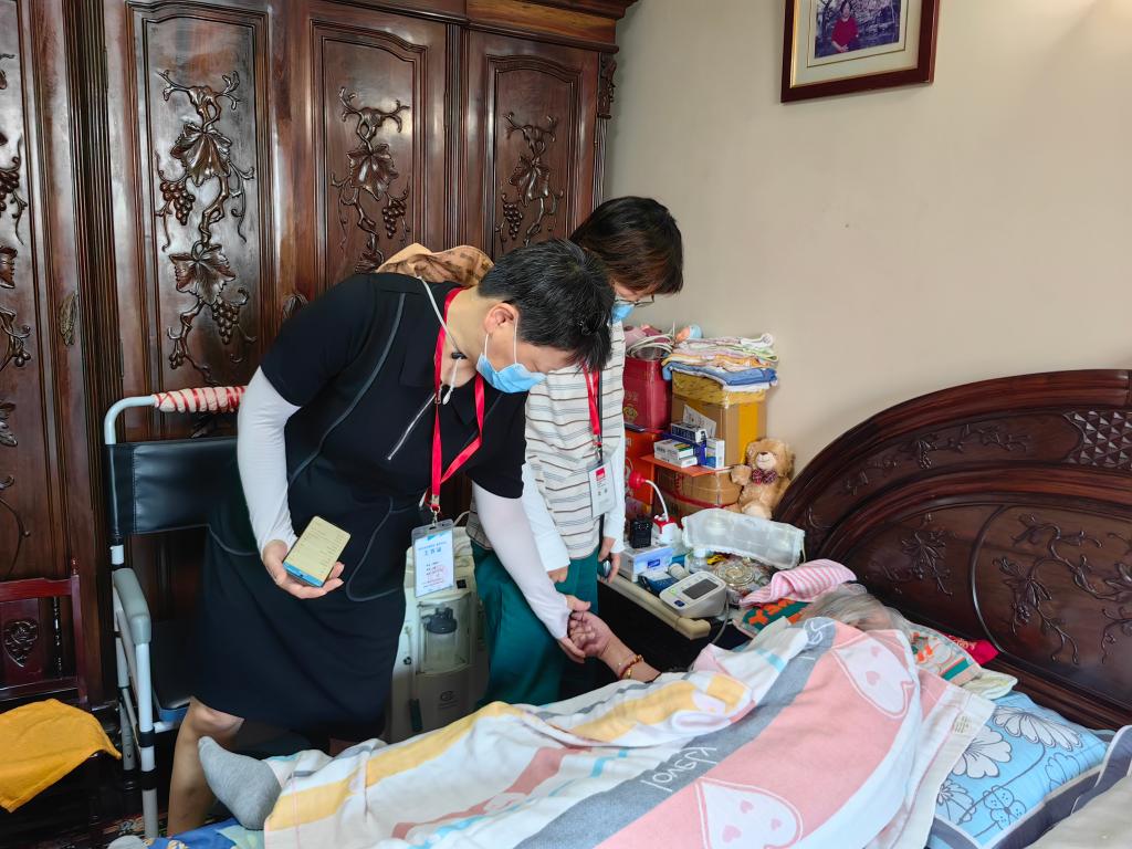 上海市普陀區(qū)老年照護統(tǒng)一需求評估員李穎芳(圖左)與社區(qū)醫(yī)生一同為老人做照護需求評估。新華社記者吳振東 攝